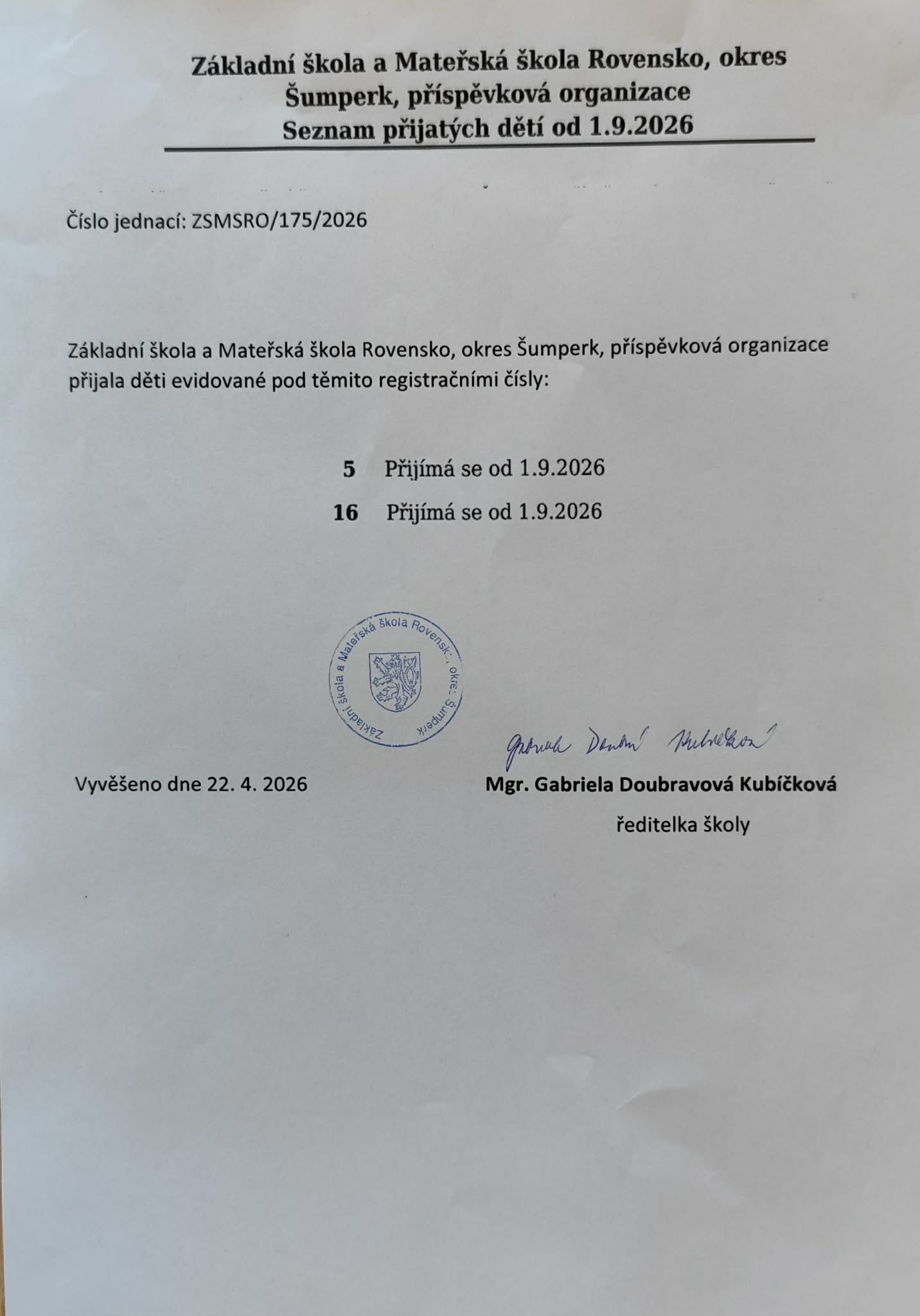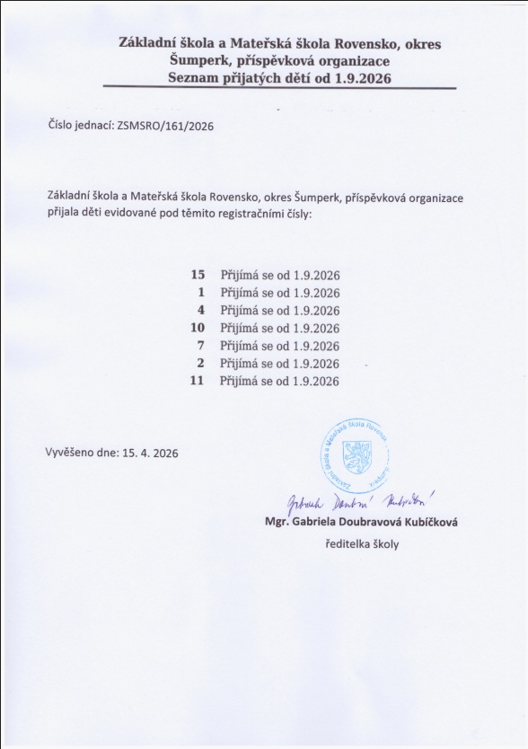 Seznam přijatých dětí bude zveřejněn na dveřích hlavního vchodu do MŠ a na stránkách školy. Seznam bude zveřejněn po dobu 15 dnů. Dětem, které nebudou přijaté, bude na adresu zákonných zástupců zasláno Rozhodnutí o nepřijetí. Vydání rozhodnutí je plánováno ke dni 15. 4. 2026.